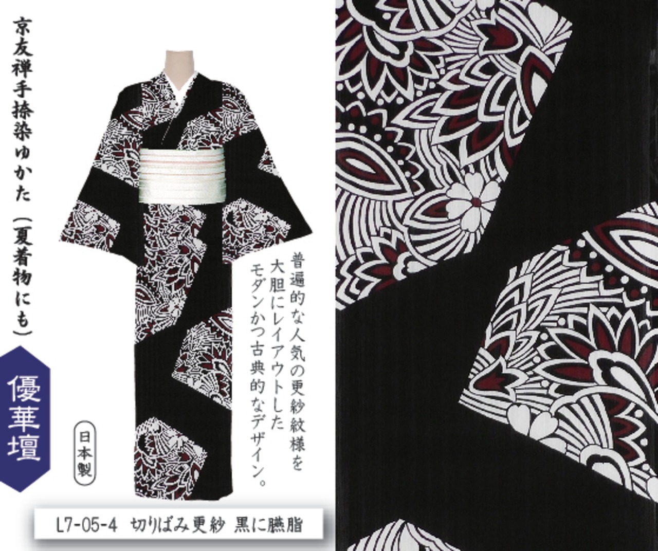 井登美 itomi 優華壇ゆかた 浴衣・夏着物 L7-05-4 切りばみ更紗 黒に臙脂