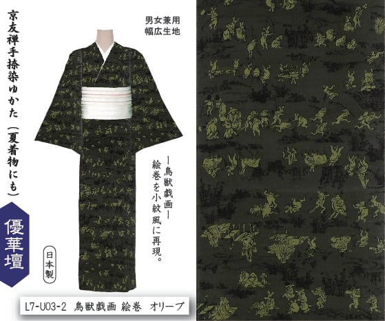 【広幅生地】井登美 itomi 優華壇ゆかた 浴衣・夏着物 L7-U03-2 鳥獣戯画 絵巻 オリーブ